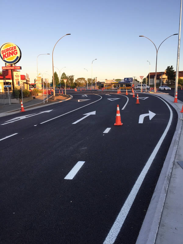 Project details: This Contract was constructed due to a new shopping complex adjacent to the intersection upgrade. We installed a 4 lane roundabout which involved widening and cement stabilisation and improved pedestrian access, stormwater drainage, lighting and vehicle flow. Vehicle Count 14,000 average per day.