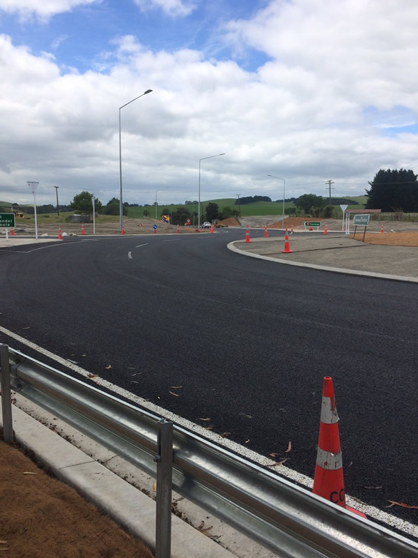 Project details: This Contract was undertaken on the busy intersection of SH2 and SH25. The contract involved overlaying the existing tee intersection with a 3 way roundabout. The roundabout carriage way was constructed of structural AC and the approaches consisted of a cement stablised basecourse. The vehicle count 13,000 average per day with very heavy weekend traffic counts due to comuters heading to coastal areas from the greater Auckland area. There were minimal traffic delays due to the roundabout construction.